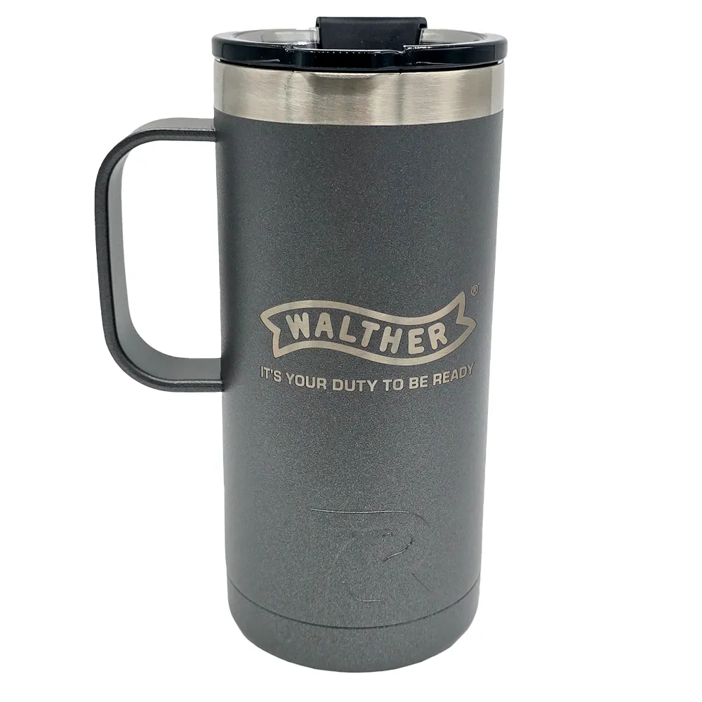Take your favorite brew on the go with the Walther Slate Gray Travel Mug. This sleek, 20 oz. stainless steel mug features a durable slate gray finish and the iconic Walther logo, blending rugged style with everyday practicality. Designed with double-wall insulation, it keeps your drinks hot or cold for hours, making it perfect for the range, road trips, or morning commutes. With a secure lid and sturdy handle, it’s built for convenience and lasting use—a must-have for Walther fans who value performance in every detail