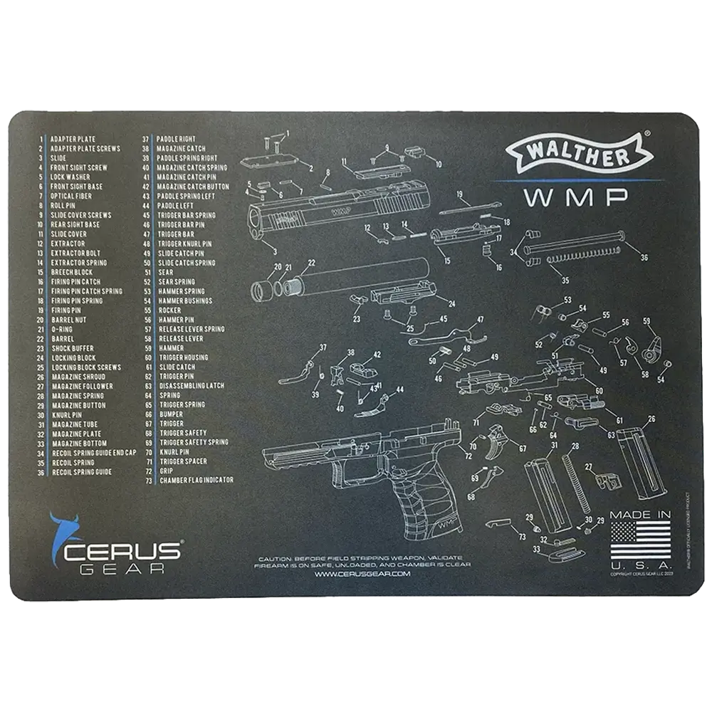 Maintain your WMP with precision using the Walther Gun Schematic Cleaning Mat. This lightweight, heavy-duty mat features a detailed WMP schematic, making it the perfect workbench companion for cleaning and assembly. Measuring 12” x 17”, its padded surface protects your firearm from scratches, while the non-slip rubber base keeps it steady and safeguards your workspace. Built from durable vulcanized rubber and polyester, it’s oil and solvent resistant for lasting use.